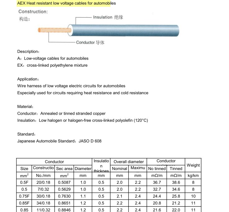 Този автомобил с много тънка стена използва термоустойчива жица с ниско напрежение, обемът е малък, теглото е леко, радиусът на огъване 5D улеснява вътрешното огъване. Освен това продуктът има висока устойчивост на абразия, устойчивост на масло и механична якост, което го прави най-добрият избор за линията за свързване на електрически компоненти в автомобила.