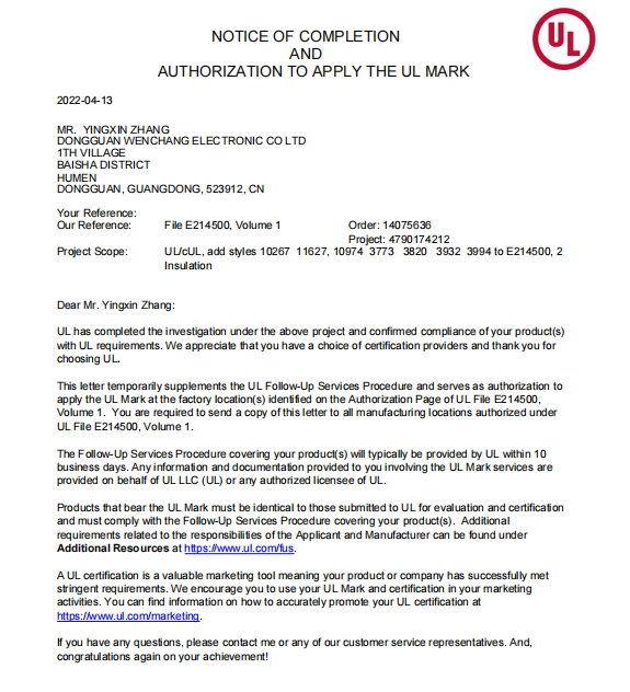 Wenchang Cable have achieved the new UL/CUL certificate , add styles UL10267, UL11627, UL10974 ,UL3773 ,UL3820 ,UL3932 ,UL 3994 to E214500, 2 Insulation , up to now , we have 700 styles UL cable.